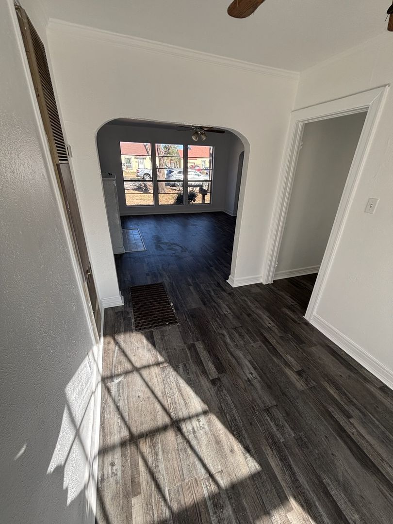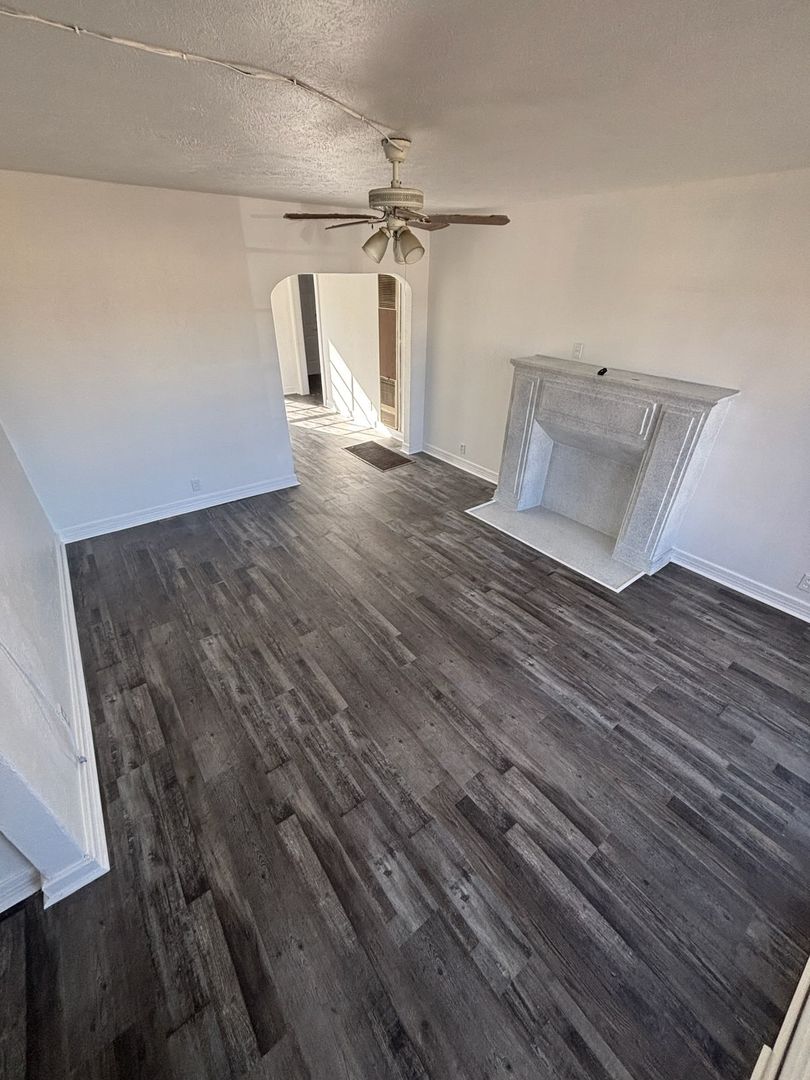 Cute two bedroom one bath home is ready for new tenants! Vinyl flooring throughout. Living room features faux fireplace and kitchen comes equipped with a gas range. Bathroom has built in linen storage. One car garage and nice size yard round out this property. Close to Turner Park, schools, and Grand Prairie farmers market.